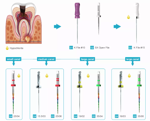 1- با استفاده از فایل (350RPM,1.5N·cm) 15.5/03 Path File مسیری روان ایجاد کنید، سپس از فایل رنگین کمانی 25/06 ( RPM 400, 2.0 N.cm) با حرکت brushing یا picking استفاده کنید تا به طول کارکرد کانال ریشه برسید.