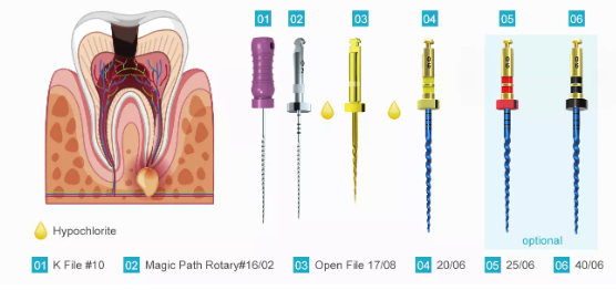 4. با توجه به آناتومی دندان، دسترسی به مدخلهای کانال ریشه را ایجاد کنید. با احتیاط با استفاده از فایل 17/08(350RPM، 2N.cm) جهت روان کردن دیواره های داخلی کانال و بزرگ کردن 1/3 کرونالی کانال اقدام نمایید.